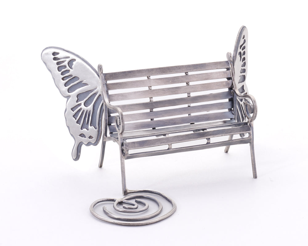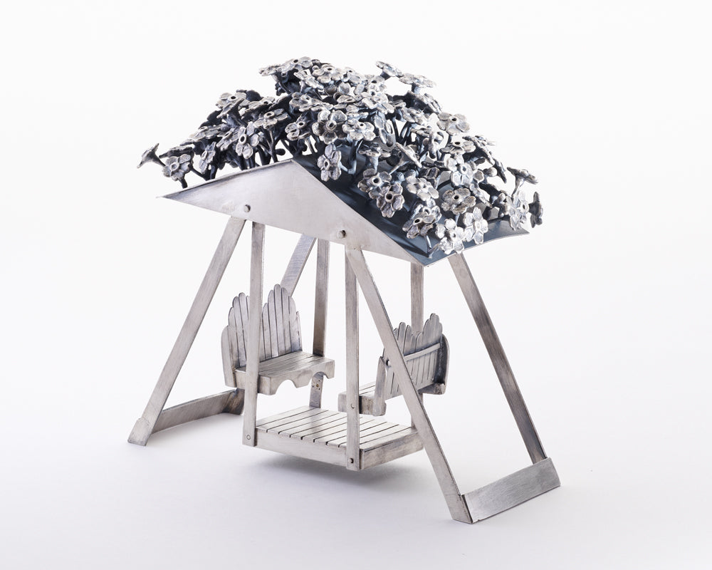 ‘Return’ is a small silver sculpture composed of a miniature park bench with swallowtail butterfly wings affixed to the back on either side and a classical labyrinth pattern circling out from its front right leg. In this piece, I distill my numerous experiences of walking labyrinths to explore the phenomenon of connection that occurs when feelings of awakening and grounding meet and rest in the same inner space. The work embodies the mystery of presence.