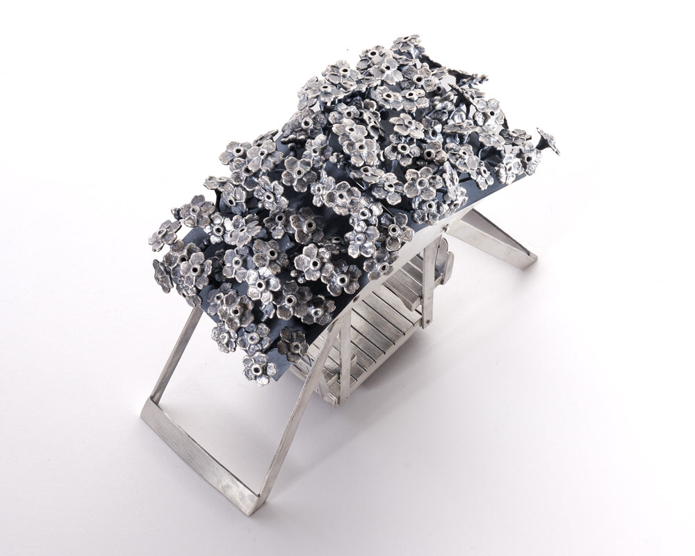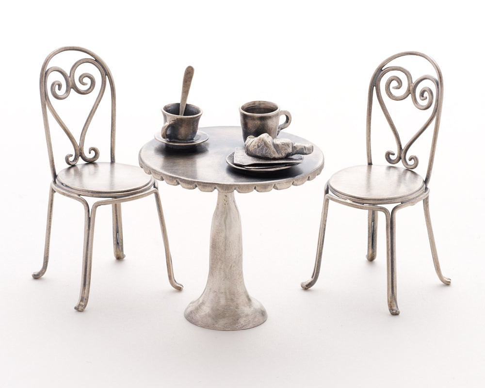 ‘For Here’ is a miniature coffee shop vignette fabricated in silver that includes two chairs set around a bistro table on top of which rests a plate that contains a croissant on a serviette, and two coffee cups, one of which is nestled in a saucer and holds a tiny spoon. The piece is inspired by the many meaningful and uplifting conversations I’ve shared at a cafe with a friend. The work is a microcosm of hospitality as it creates room for trust, intimacy and comfort, despite being open to public view.