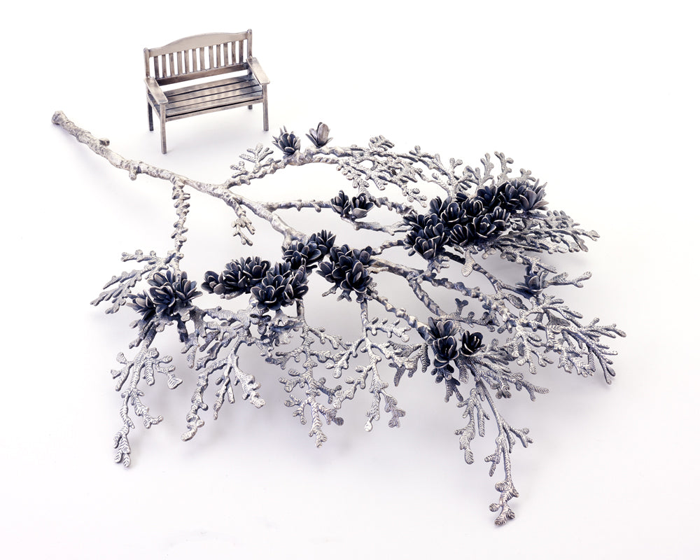 This two-part silver sculpture of a northern white cedar branch with clusters of blooming cones accompanied by a miniature park bench is inspired by my visits to a large cedar hedge that lives along a stretch of the Iron Horse Trail near my house in Kitchener. In this work I place lengths of silver wire in a fractal pattern and fuse them together with a torch to create a contemplative conversation about the shape of inter-connection and well-being. The piece expresses the kinship I feel with cedar.