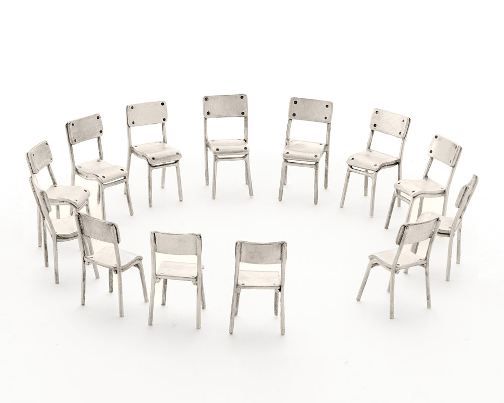 ‘In a Circle’ is a miniature instillation consisting of thirteen hand-fabricated silver chairs arranged in a circle. This piece reflects my memories of working at a retreat centre where sitting in a circle was a recurring and significant responsibility. The work encapsulates presence and belonging as it distills and holds considerable emotional weight from experiences of vulnerability, connection and deep listening.