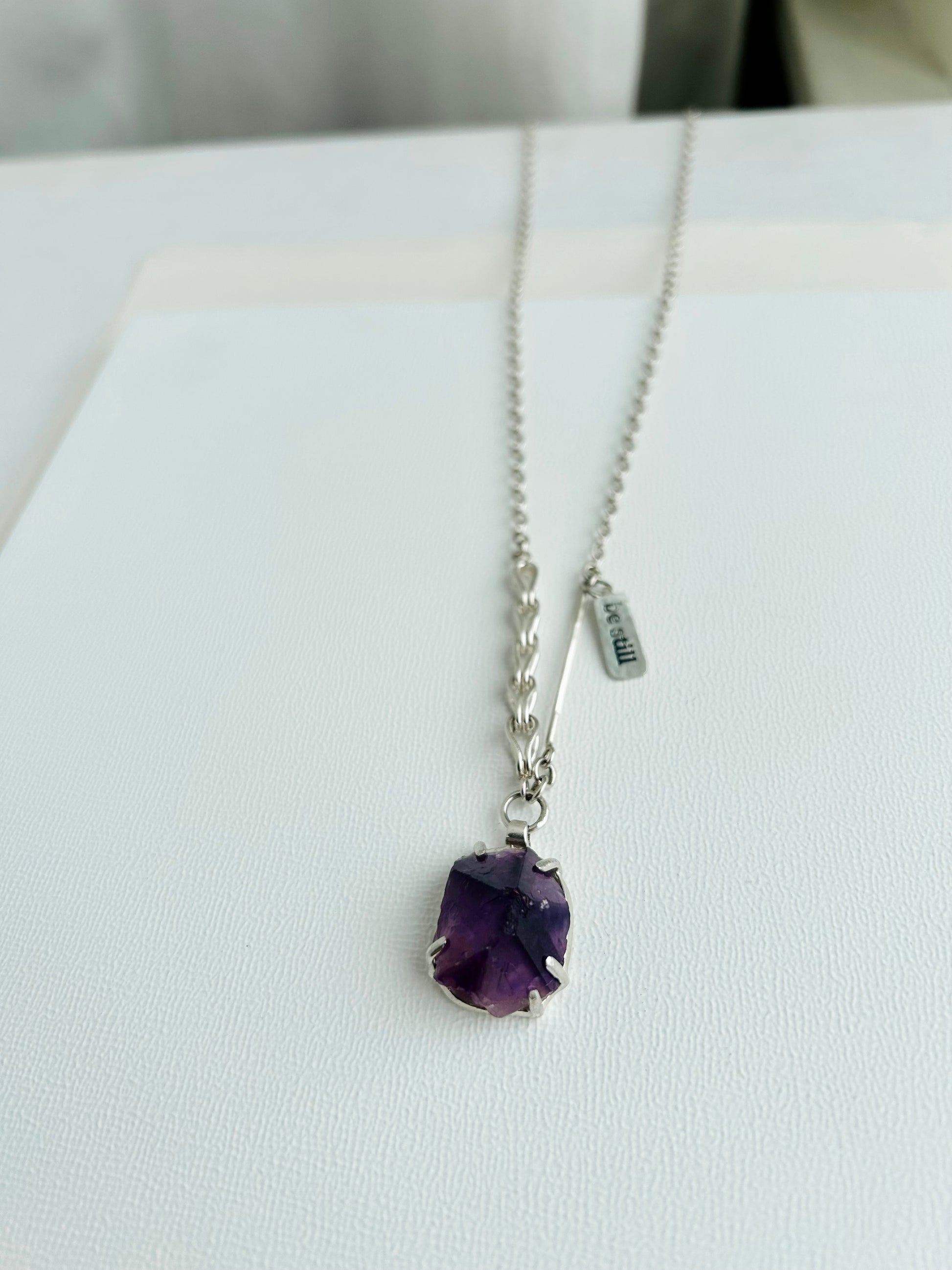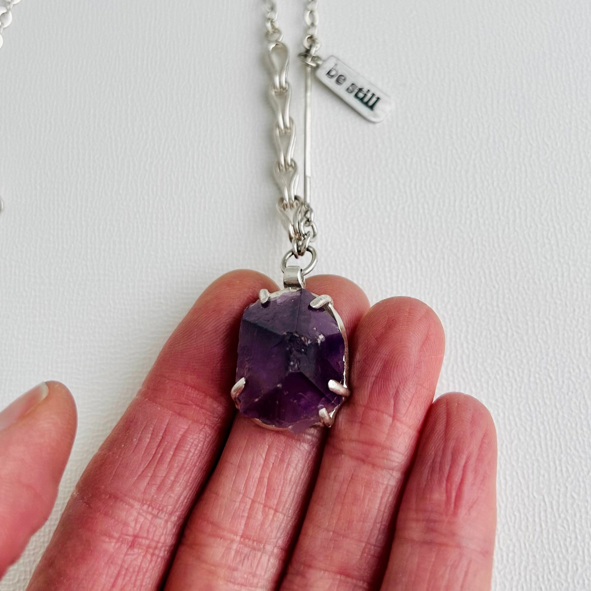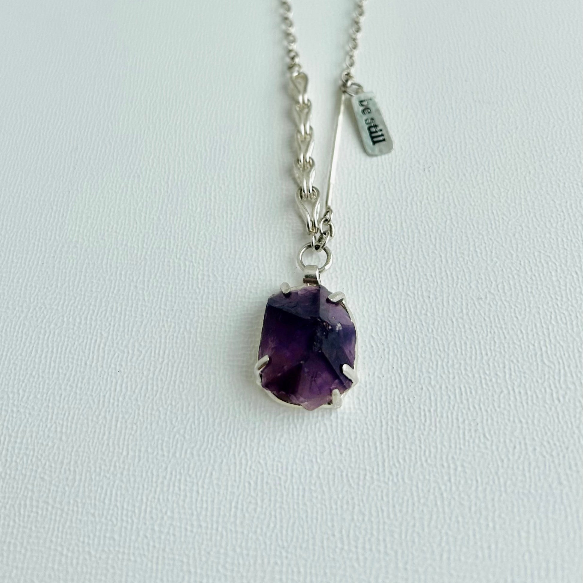 This handcrafted necklace features a pendant of raw amethyst in a sterling silver prong setting.