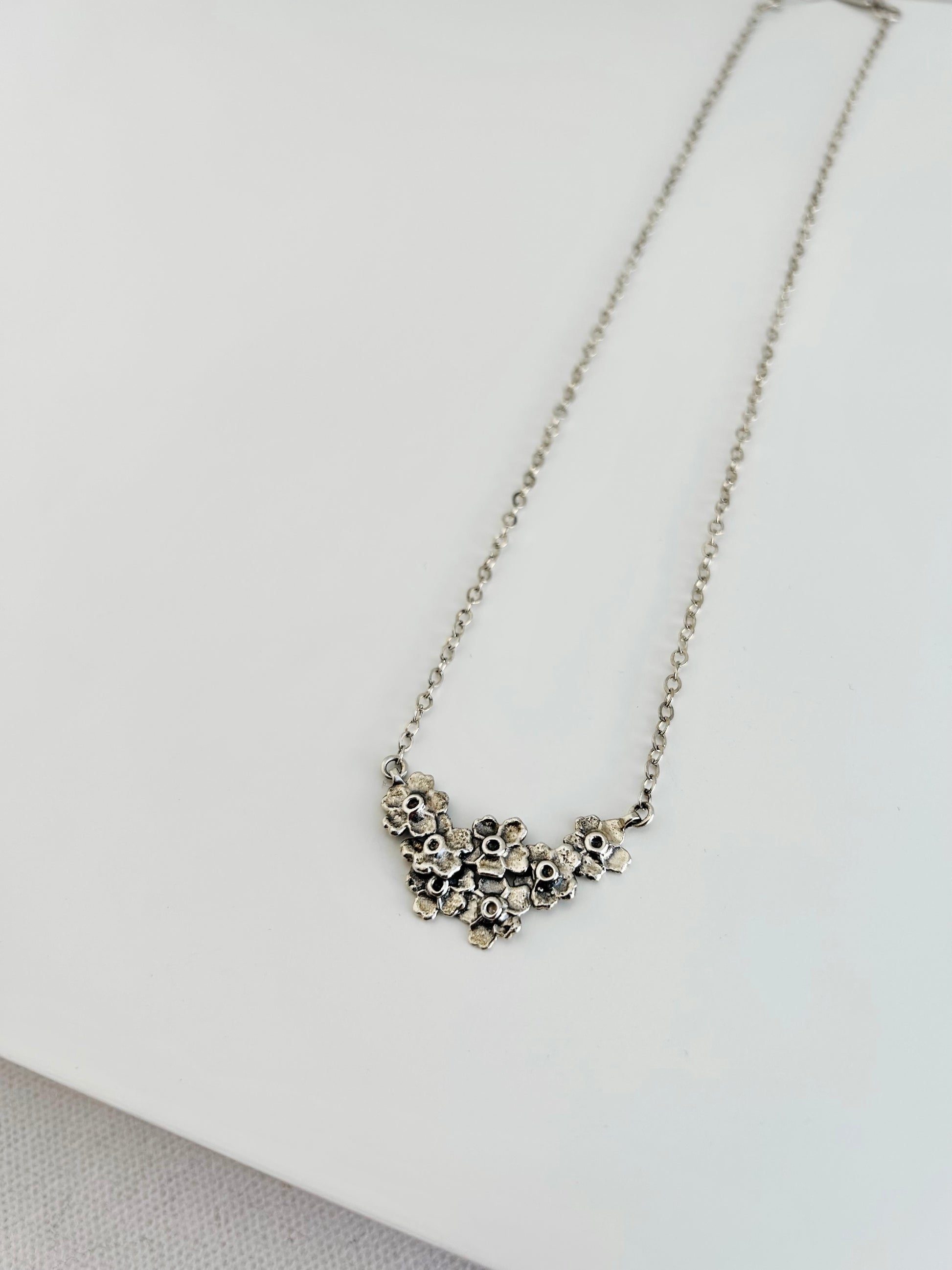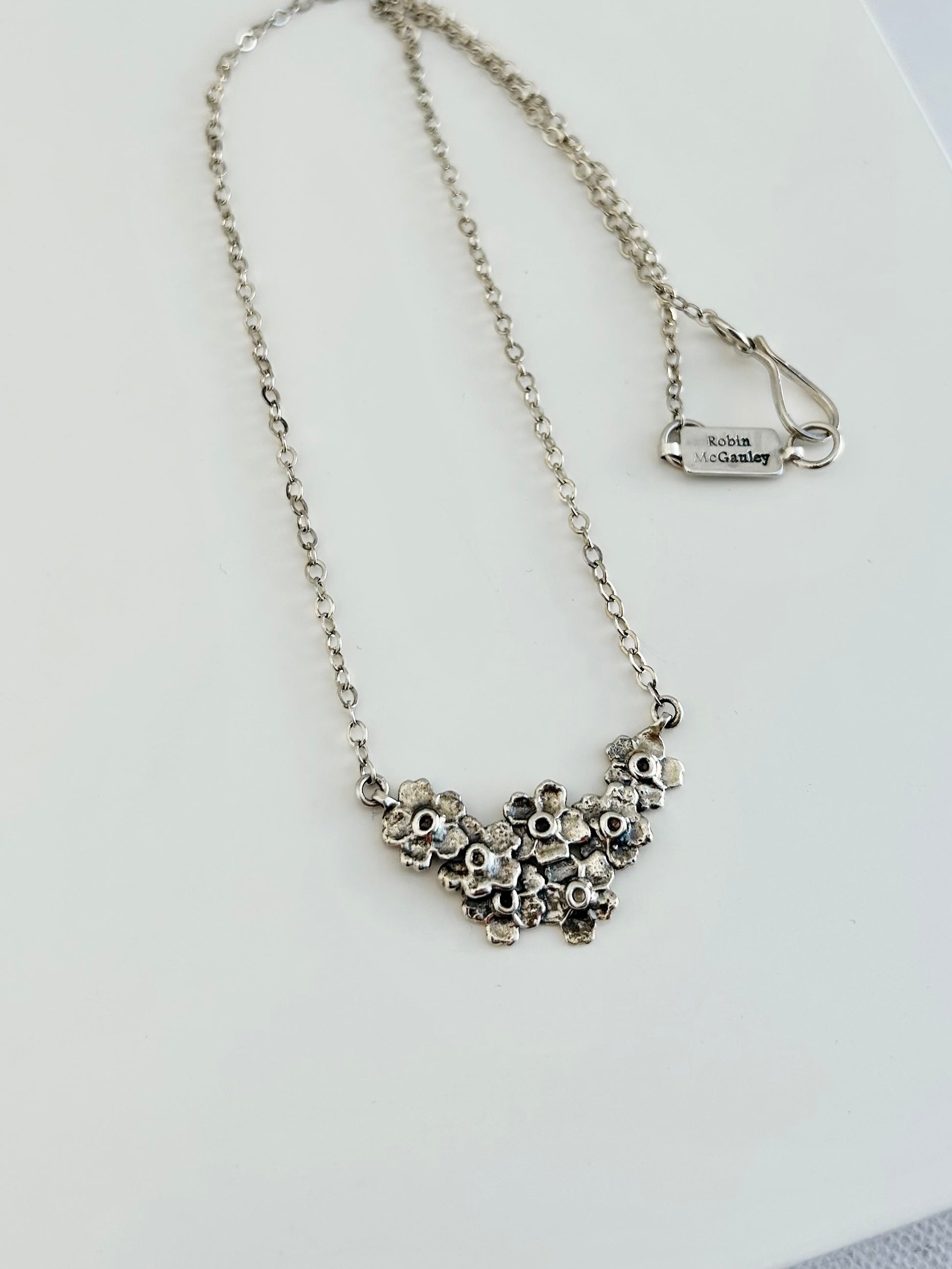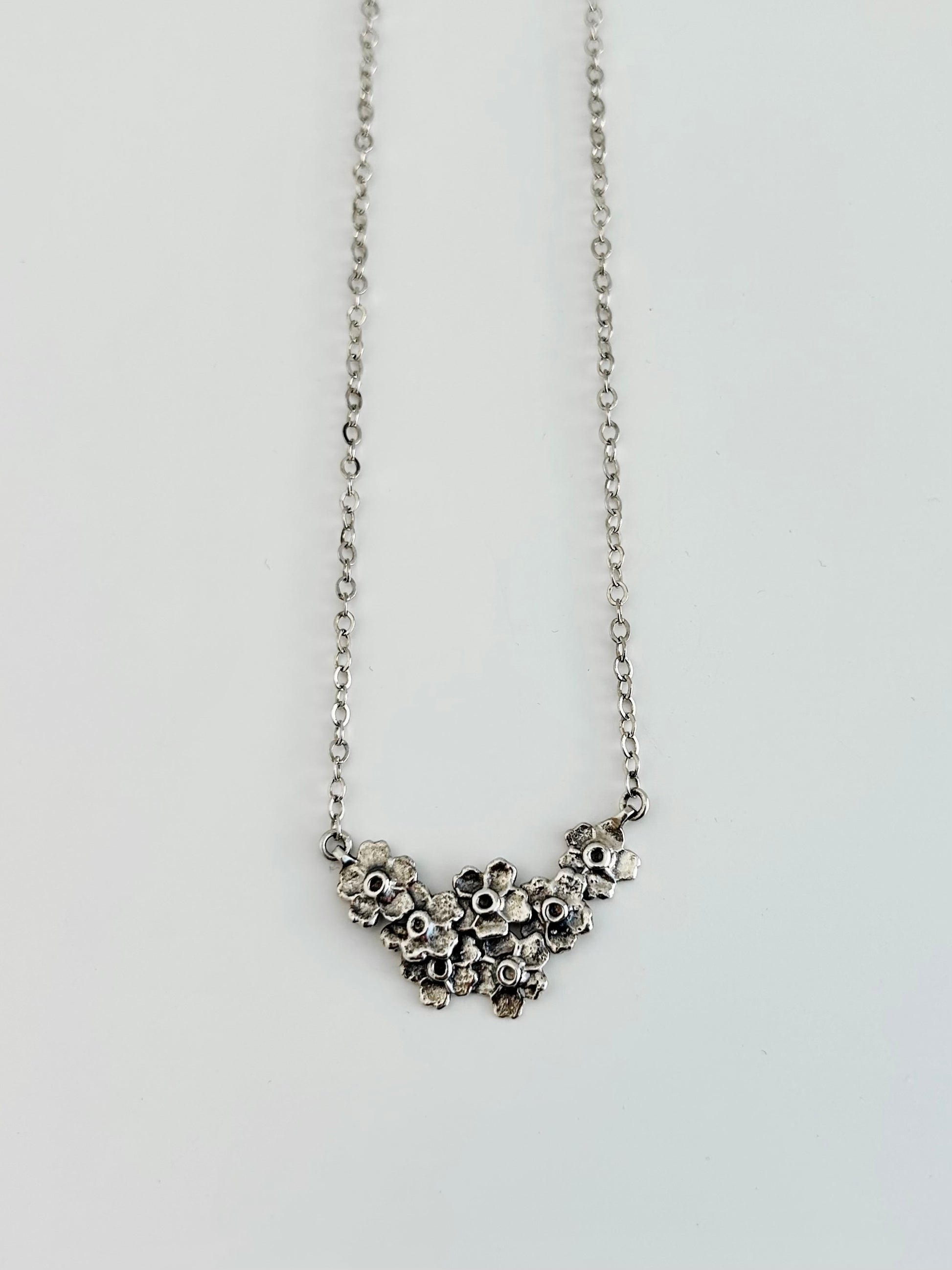 This one-of-a-kind necklace is hand fabricated in sterling silver. It features a cluster of seven Forget-Me-Not flowers.