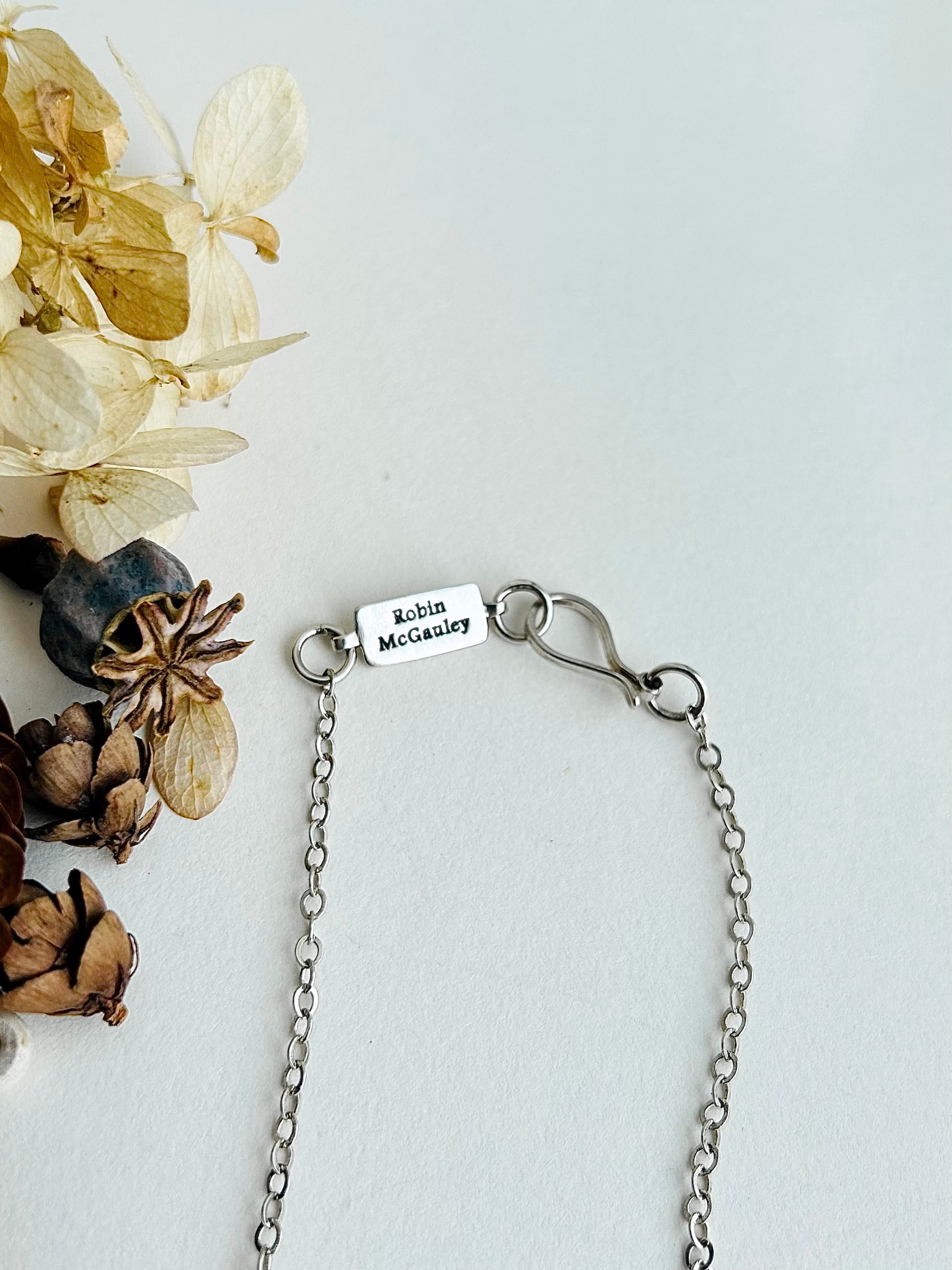 Rose cut garnet cabochon is set in a fine silver bezel.