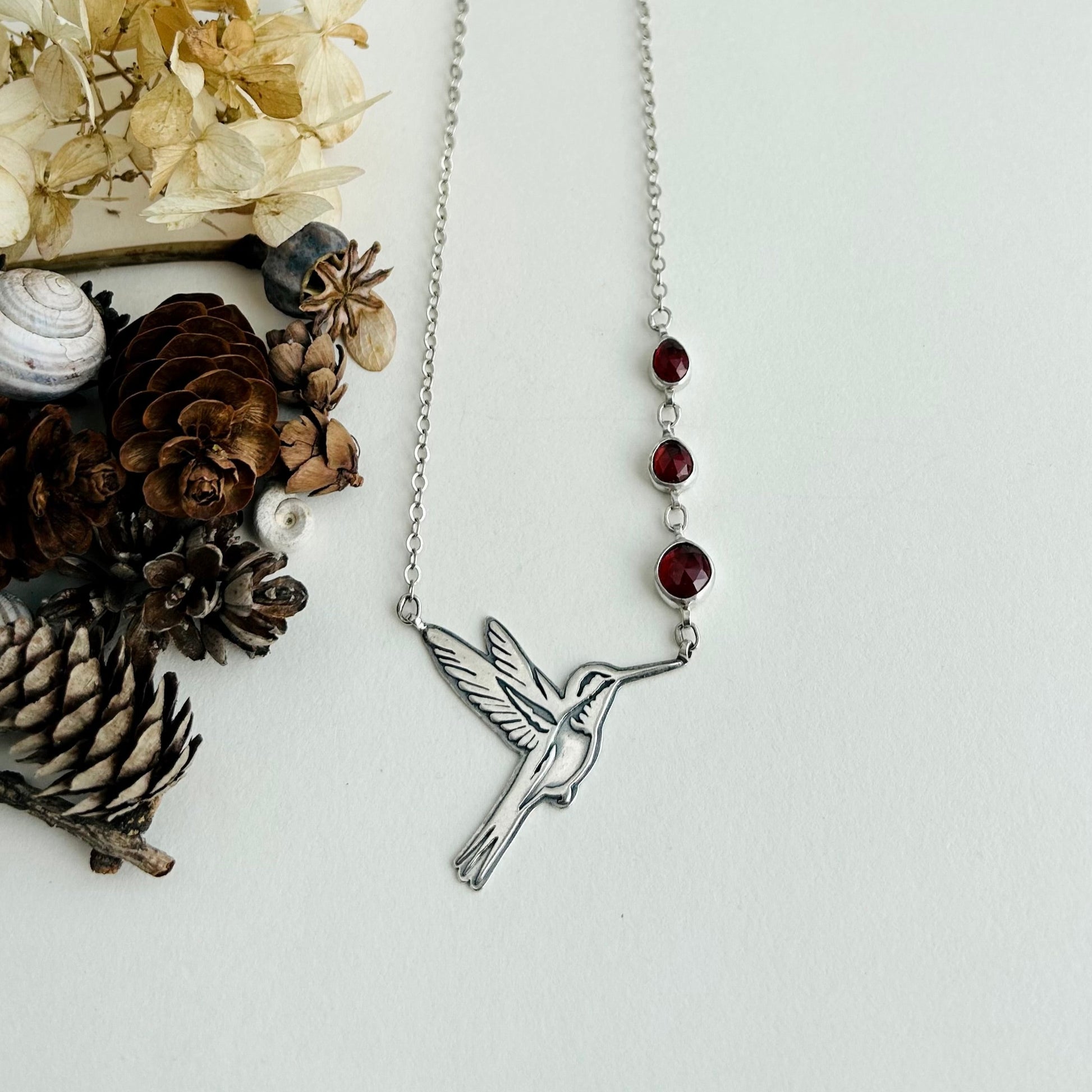 Hummingbird Necklace with Garnets