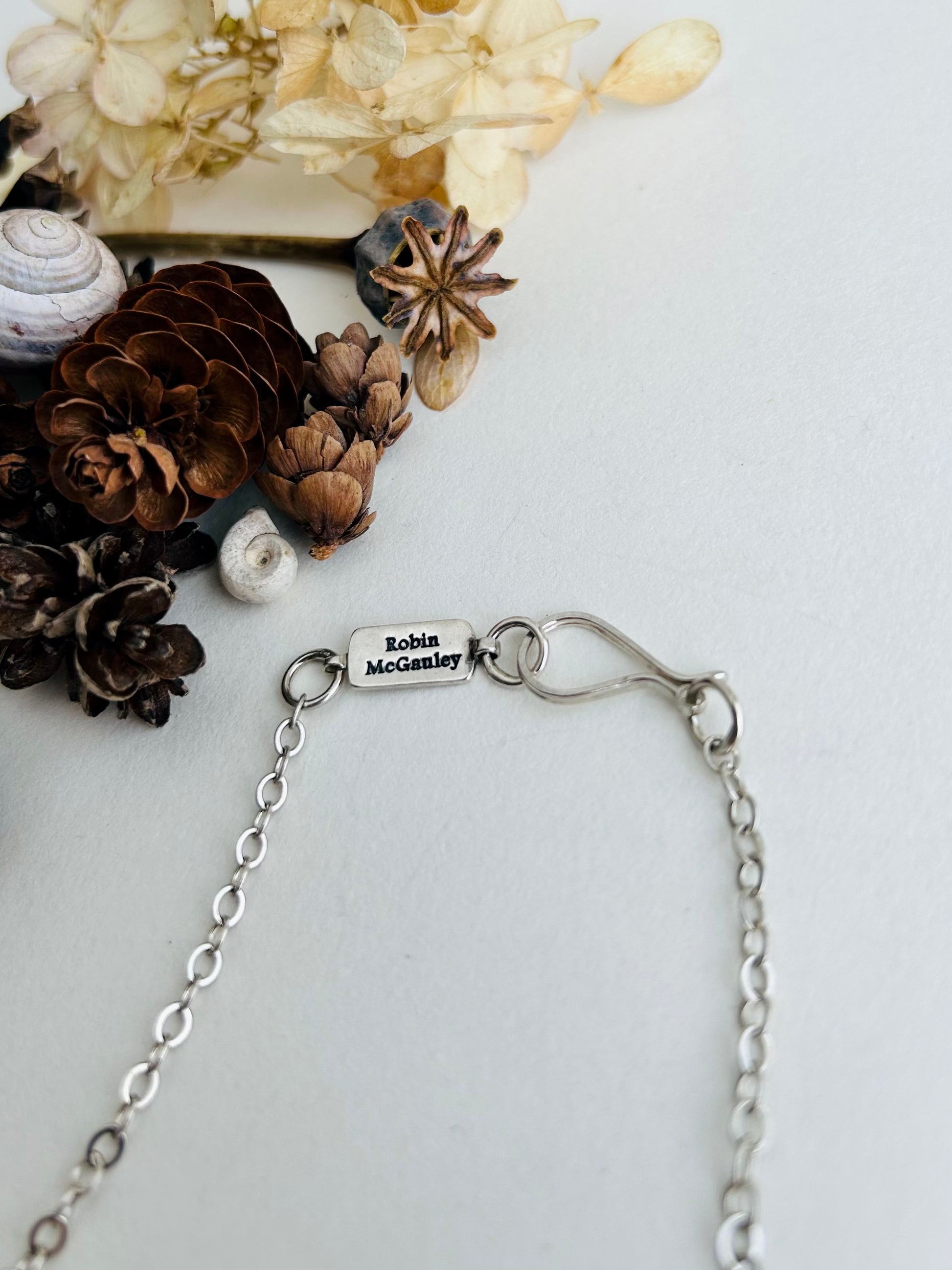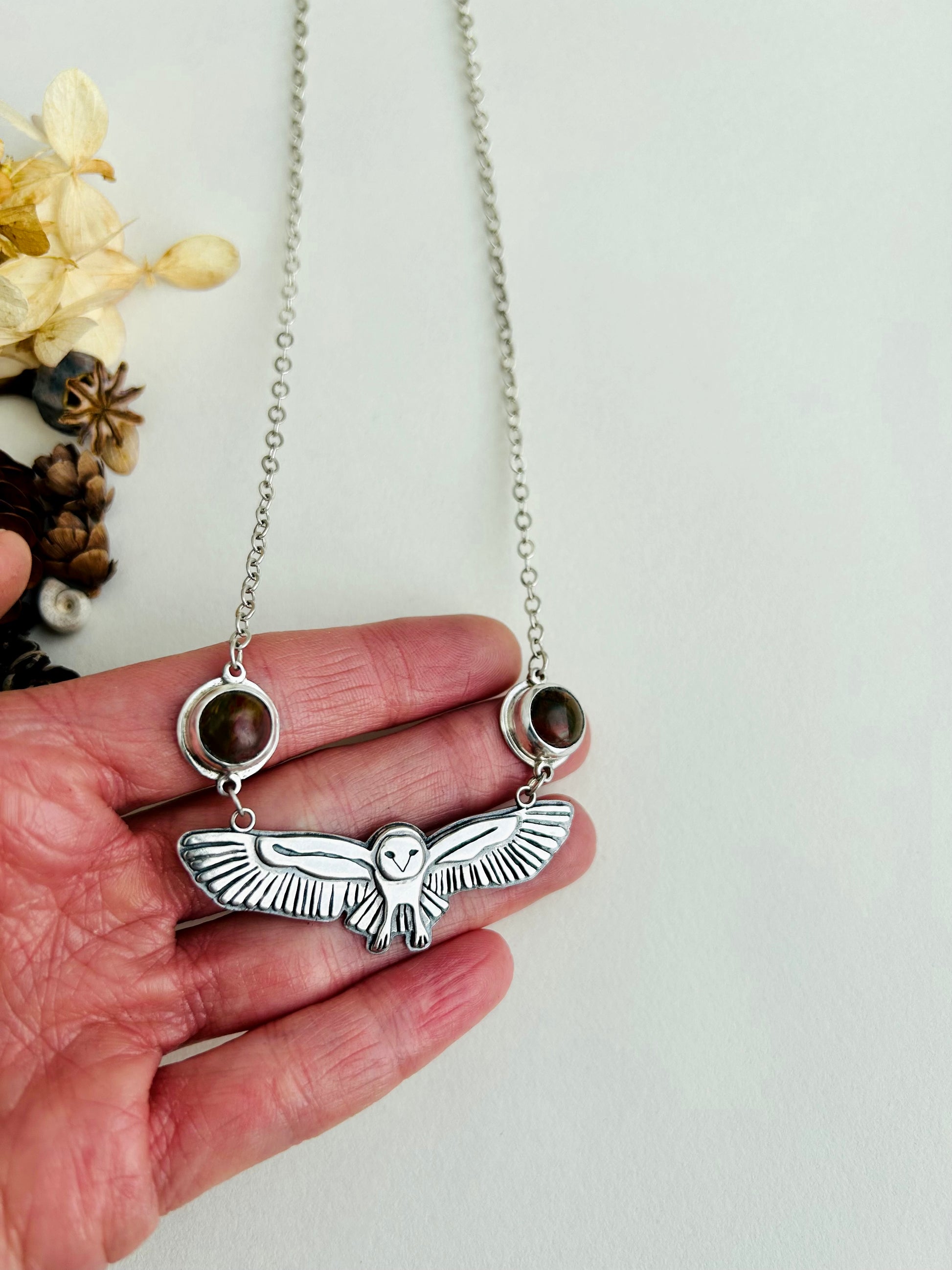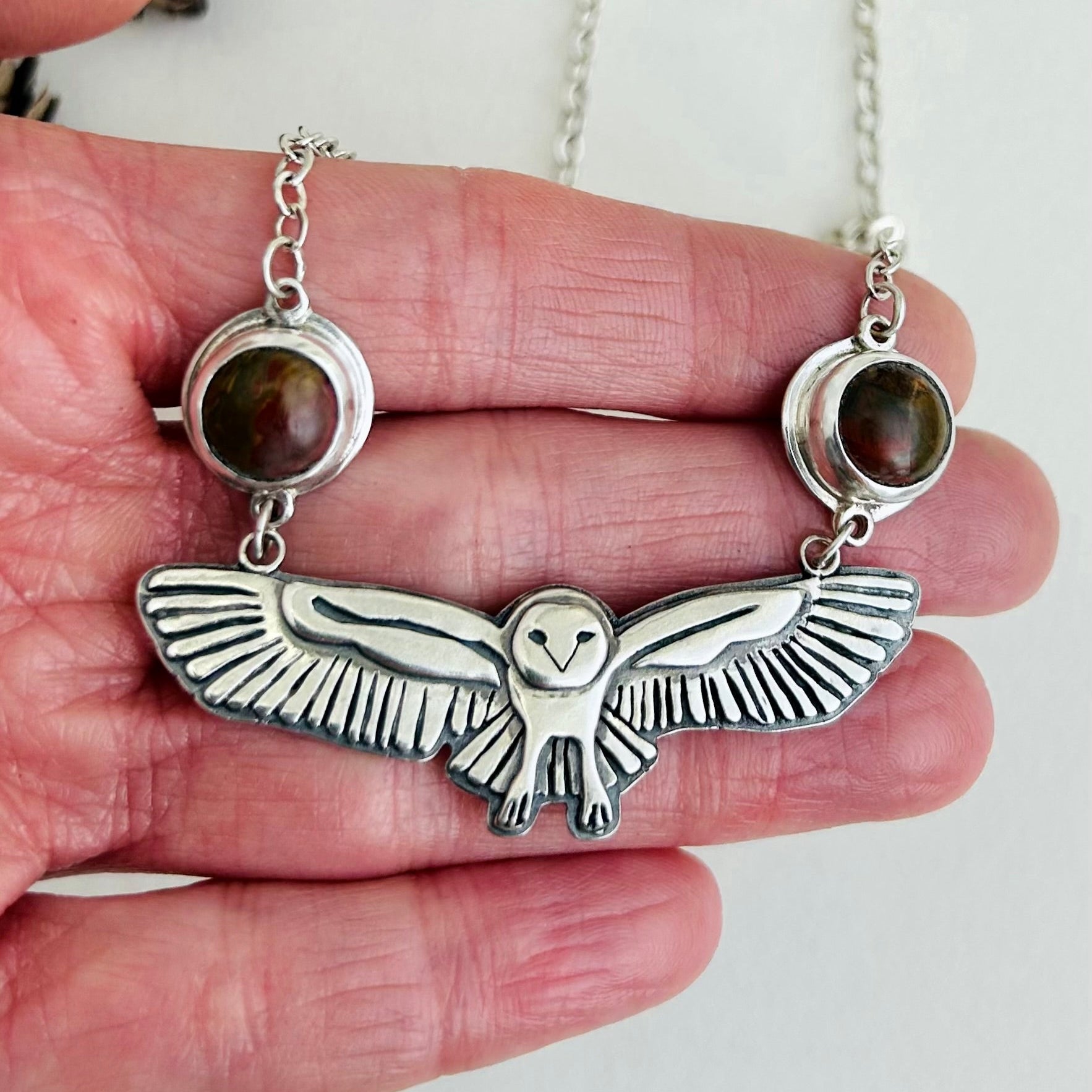 I cut the owl pendant by hand out of sterling silver. It is three layers of detail that I soldered together.