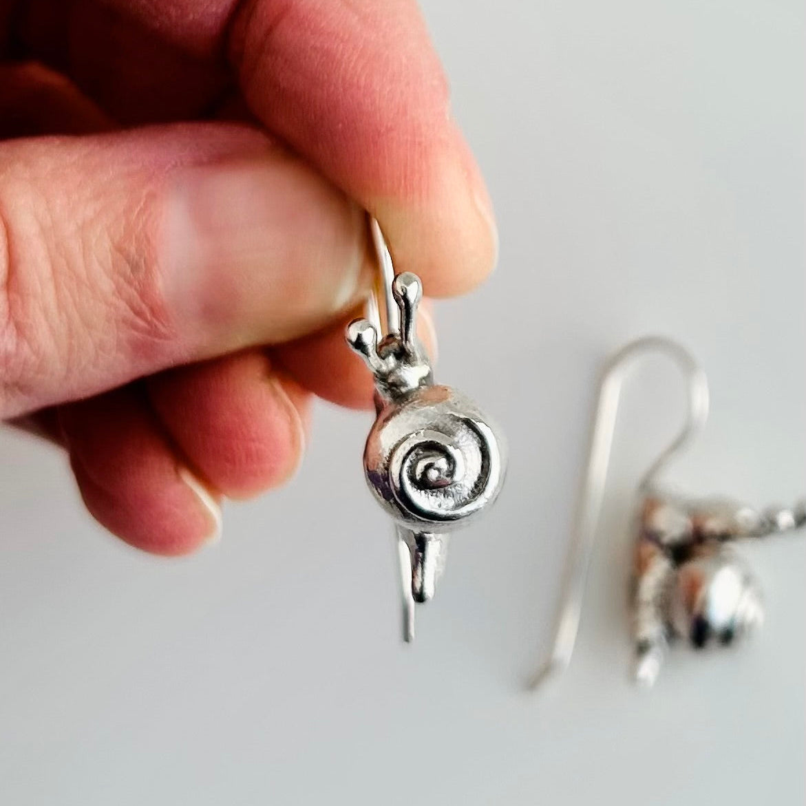 These tiny snail earrings are hand-fabricated in sterling silver.