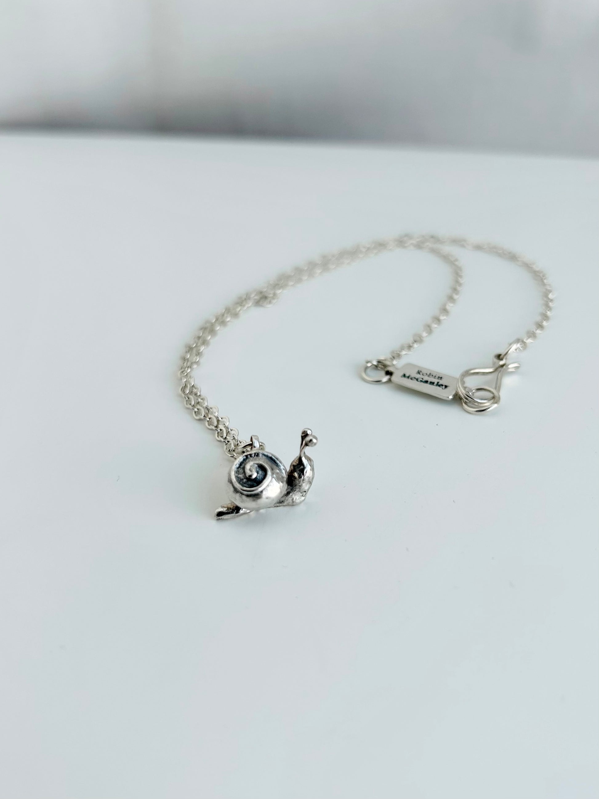 The one-of-a-kind pendant is a tiny sculpture of a snail that I hand-fabricated in sterling silver.