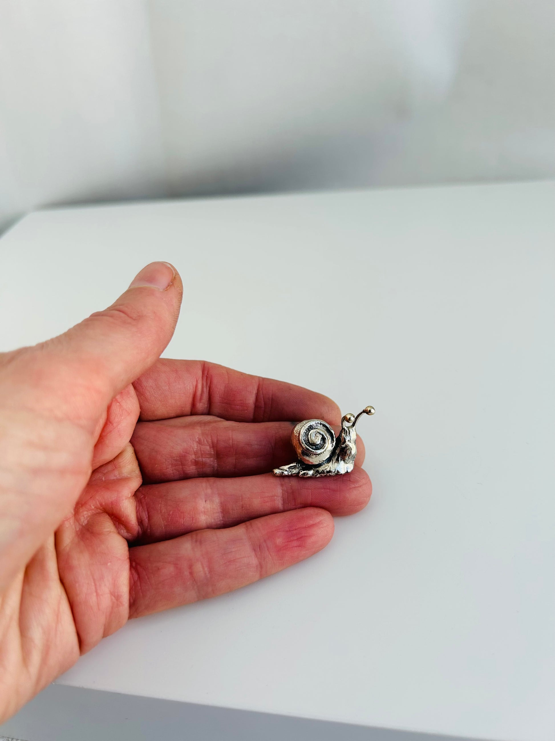 Each of my small Snail figurines is hand-fabricated in sterling silver and, therefore, completely unique. They all have their own individual personality!
