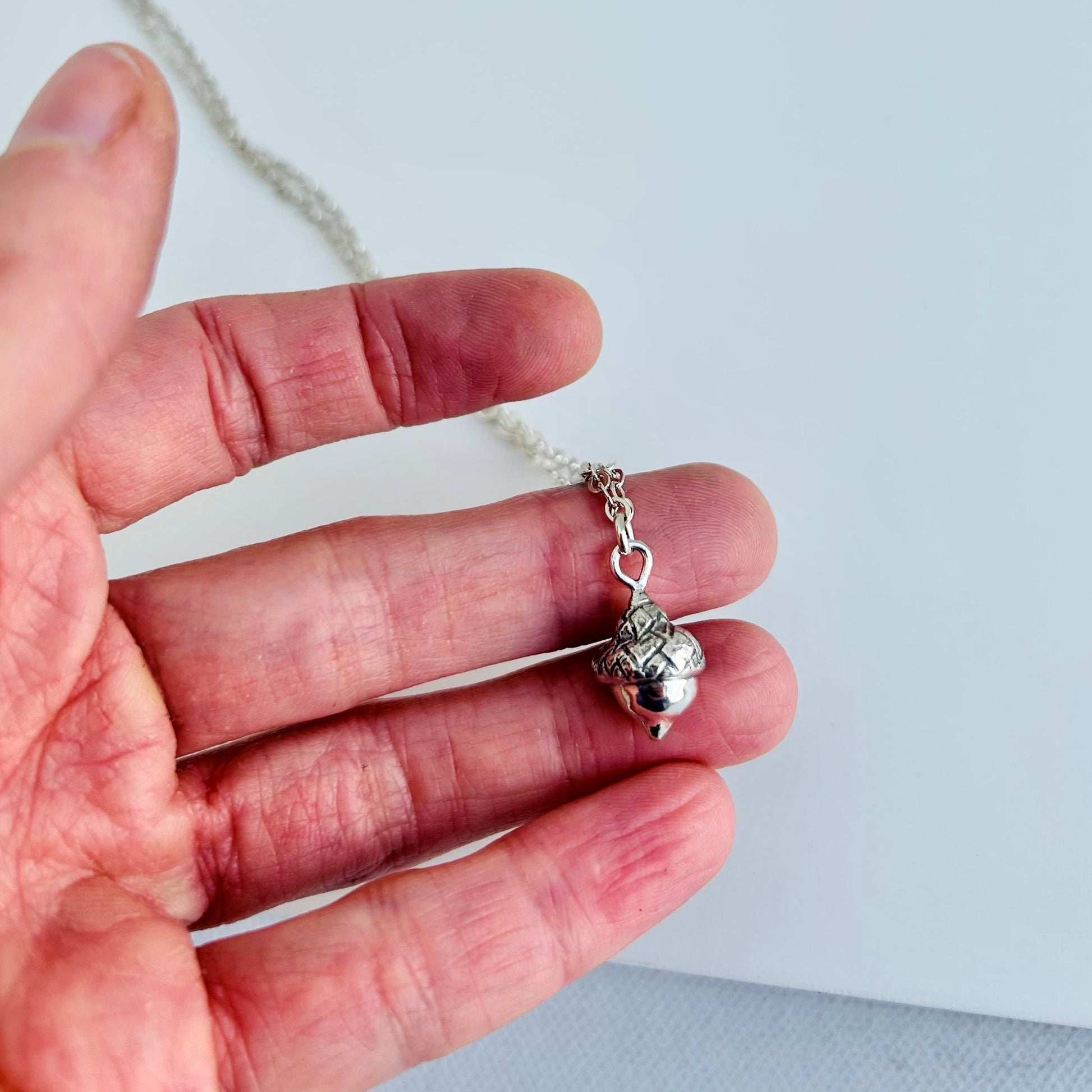 I used metalsmithing fabrication techniques to create the tiny acorn in sterling silver.